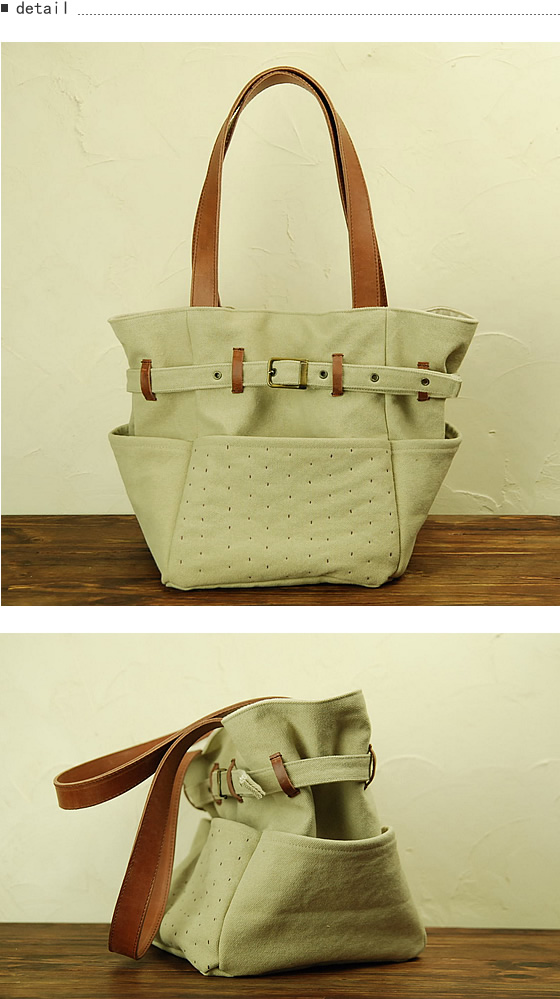 底が正方形でサイドの4面の大きなポケットが印象的なショルダーバッグ。 前後のポケットにパープルの糸で点々のステッチを入れています。 ヴィンテージ加工の帆布なのでクタッとして使い込んだような風合いがあります。