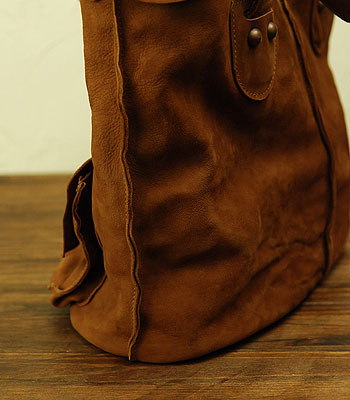 革の持つ素朴な印象に合わせて、おおきめのポケットを付けました。はじっこ革のフラップはギボシでちょんと留めます。