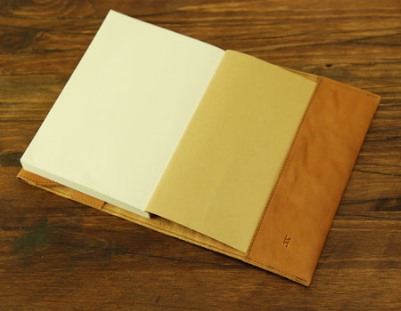 ヌメ革はもともと硬めなので、そのままブックカバーにすると少しゴワゴワしますが、薄手のヌメ革をウォッシュ加工して、手もみを加えてふわっとさせてから制作しているので、使い始めから本にしっくりとなじみます。
