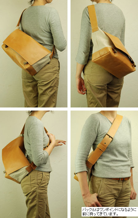 ヌメ革と麻帆布の組み合わせがキュートなメッセンジャーバッグです