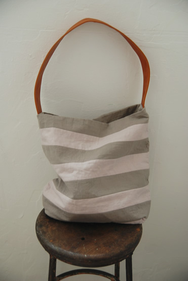 グレーとベージュが混ざったような色と、あずきが薄くなったような色のリネン地を縞々に縫い合わせてバッグを作りました。 ワンハンドルに使用した牛革は柔らかく、肩のあたりがやさしいです。 マチがたっぷりで、普段使いに丁度いいサイズ。