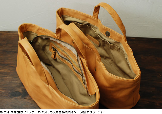 中のポケットは、幅20センチのファスナーポケットと、幅33センチの大きなポケットを2分割した構成になっています。