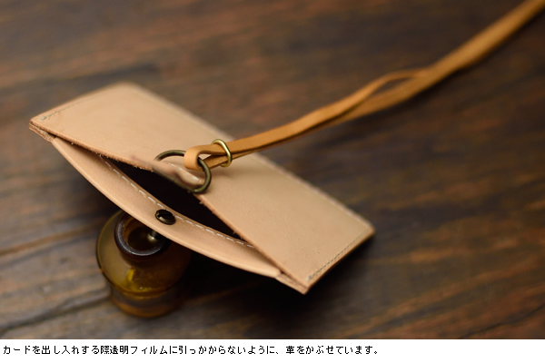 シンプルな形ですが、入口のところは革を折り曲げて、スムースにカードが出し入れしやすいようにしてあります。